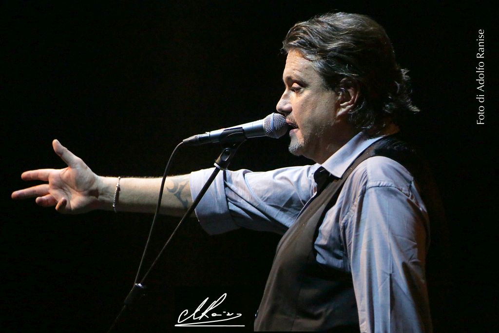 Cristiano De André sul palco è accompagnato da Osvaldo Di Dio, Davide Pezzin, Davide Devito e Riccardo Di Paola.