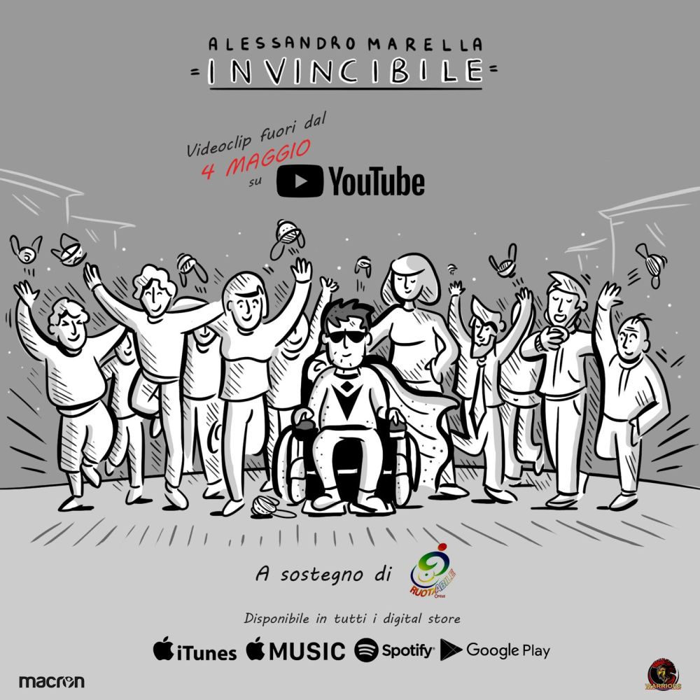 Il videoclip in motion graphics di“INVINCIBILE” (regia e soggetto di Michele Piazza per TofuFilms, animatori Antonella Fabiano e Zeno Tamagni-Lazzari, background & art direction di Lele Gastini)è ambientato proprio in questo periodo di emergenza sanitaria. Vediamo quindi un mondo grigio in cui due ragazzi, di cui uno in sedia a rotelle, si notano dalla finestra e iniziano a comunicare a distanza: non possono infatti uscire di casa per il virus che sta dilagando. Alla fine, con la forza dell’immaginazione e dell’amore, riescono ad abbracciarsi e in quel momento il mondo torna ad essere finalmente a colori! Nel videoclip c’è anche un riferimento al wheelchair hockey team MACRON WARRIORS VIADANA, squadra in cui Alessandro si allena da anni e che ha contribuito allo sviluppo del progetto, e alla MACRON, azienda leader nella produzione e vendita di active sportswear con sede a Bologna che ha sostenuto economicamente parte del progetto.
