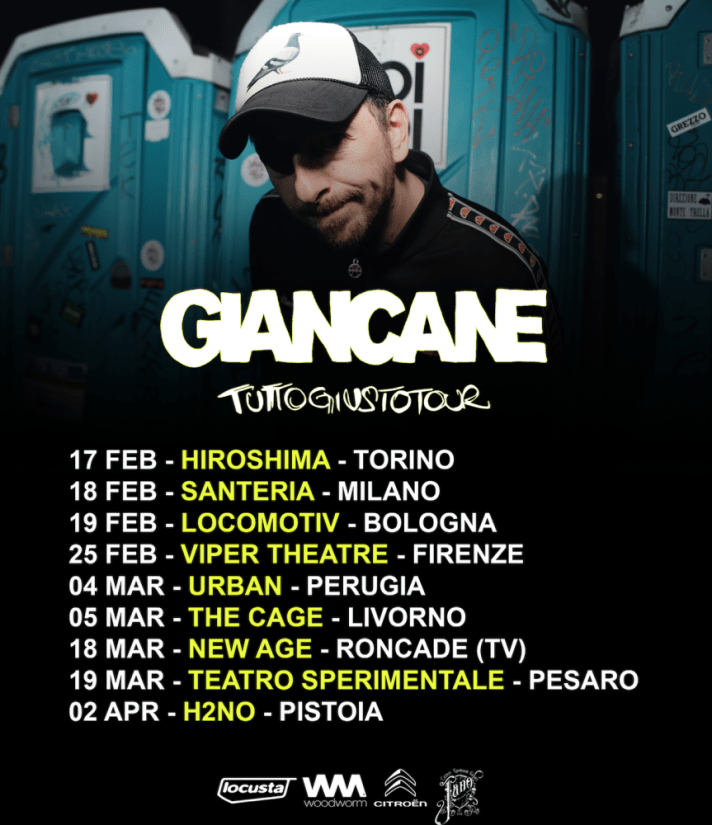 Giancane torna sul palco nei principali club italiani con TUTTOGIUSTOTOUR. Dopo i tantissimi concerti estivi con L’inizio della Fine Tour, il cantautore romano torna sui palchi dei live club italiani con un nuovo spettacolo. Il tour prenderà il via il 17 febbraio da Torino (Hiroshima), per poi proseguire a Milano (Santeria) il 18 febbraio, Bologna (Locomotiv) il 19 febbraio, Firenze (Viper Theatre) il 25 febbraio, Perugia (Urban) il 4 marzo, Livorno (The Cage) il 5 marzo, Roncade, TV (New Age) il 18 marzo, Pesaro (Teatro Sperimentale) il 19 marzo e Pistoia (H2NO) il 2 aprile. Le prevendite sono disponibili dalle 12.00 di oggi sui principali circuti di vendita.