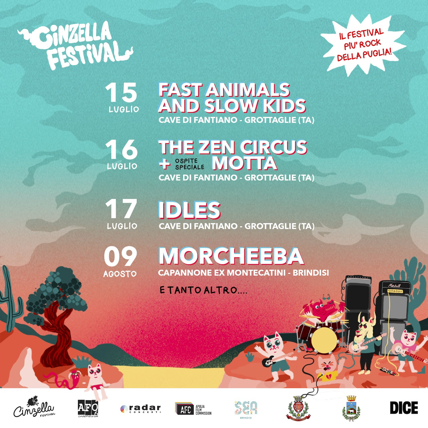 CINZELLA FESTIVAL, il festival come sempre dedicato a musica e cinema torna nel 2022 con un doppio appuntamento: 15-16-17 luglio nell’incantevole e unico scenario delle CAVE DI FANTIANO a GROTTAGLIE (TA) e il 9 agosto presso il CAPANNONE EX MONTECATINI di BRINDISI (zona porto), per la direzione artistica dell’attore Michele Riondino. I biglietti sono già disponibili sulla app di ticketing DICE. Presto saranno annunciate le giornate relative al cinema.