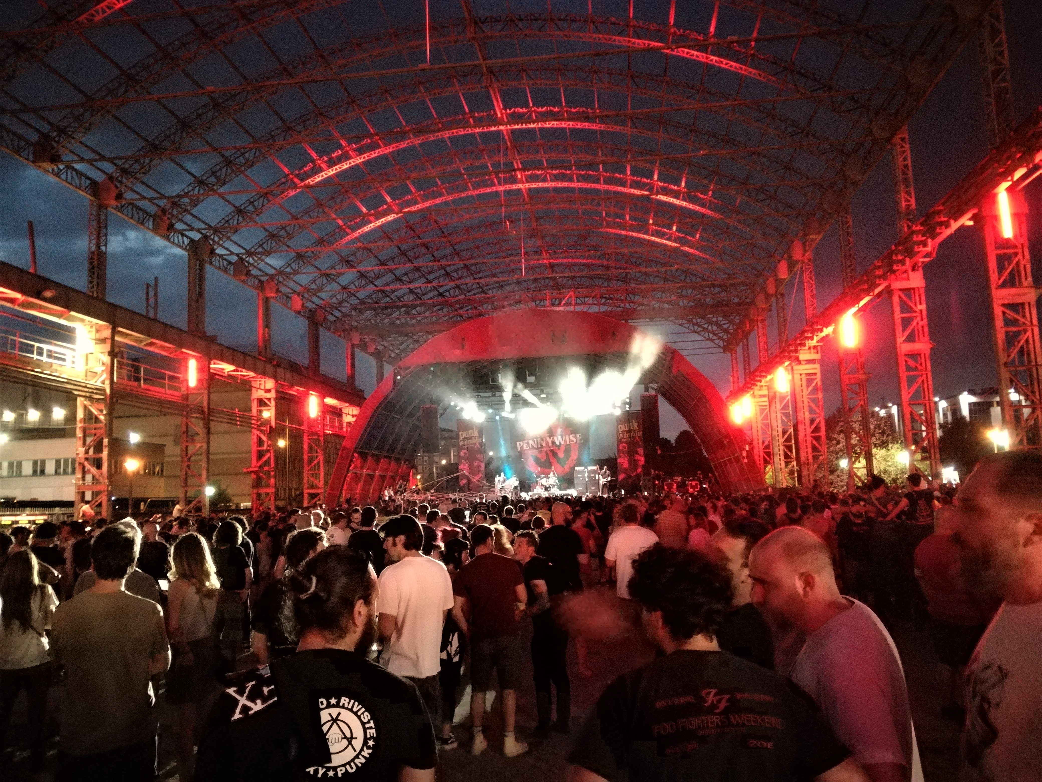Sono i Pennywise che ci separano dal concerto dei Nofx e me li guardo a distanza, in fila, per le birre (vedi sopra). Mi gusto l’immenso striscione “PW” illumiato spesso di rosso e accomagnato da perle come “Bro Hymn”, “Fuck Authority”, “Society” e la dolcissima “Stand by me” che irrompe nelle file di irriducibili, in attesa di abbeverarsi. Sarà che il Carro è così bello, sarà che ho aspettato la birra guardando – seppur da lontano – i Pennywise sul palco, ma mi riavvio felice verso il palco, carico di birre scansando un po’ di persone tra cui Fat Mike in persona che, con uno spettacolare gonnellino in pelle nera, si avvicinava al suo momento sul palco.