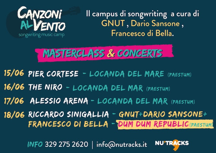 Si svolgerà dal 15 al 19 giugno a Paestum (Sa) il campus estivo di songwriting Canzoni al Vento, progetto formativo organizzato e prodotto da Nu’Tracks. Ideatori del campus sono gli artisti Claudio “GNUT” Domestico (cantautore, chitarrista, produttore artistico e compositore di colonne sonore dalla lunga militanza nel circuito musicale italiano), il frontman del gruppo folk/rock Foja Dario Sansone (cantautore nonché disegnatore e regista presso la factory Mad Enterteinment) e Francesco Di Bella noto sin dagli anni 90 come cantante, compositore e leader della storica band partenopea 24 Grana.