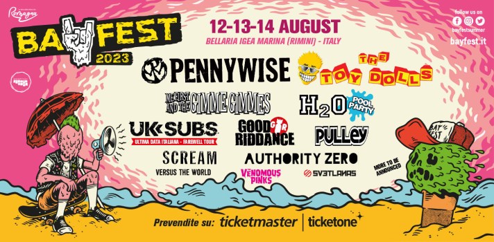 Ultimi nomi in scaletta: Authority Zero, band dall’Arizona con oltre 25 anni di attività alle spalle e a chiudere il bill The Venomous Pinks, terzetto tutto al femminile che tiene in alto il vessillo del punk rock. Drea Doll e socie sono fedeli ad un certo tipo di sound e passeranno dal Bay Fest dopo aver di recente terminato il tour in supporto ai Dead Kennedys.