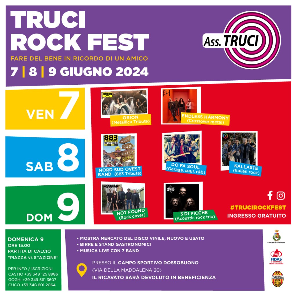 Saranno tre giorni tra musica e divertimento quelli del Truci Rock Fest, che si terrà da venerdì 7 a domenica 9 giugno negli impianti sportivi di Dossobuono (Vr). Nell’ampia area con ingresso da via della Maddalena, si esibiranno 7 band. Buona parte del ricavato della manifestazione, dedicata alla memoria dell’amico Corrado “Truci” Bompan, sarà donato in beneficenza.
