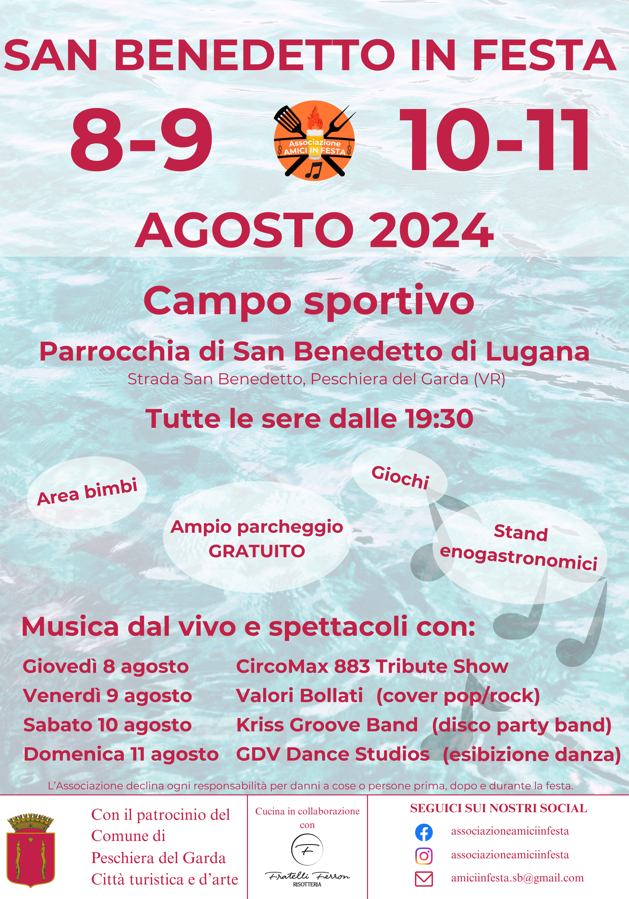 La festa si terrà nell’area adiacente alla parrocchia di San Benedetto di Lugana, strada San Benedetto, Peschiera d/G (VR) e sarà disponibile un ampio parcheggio gratuito.