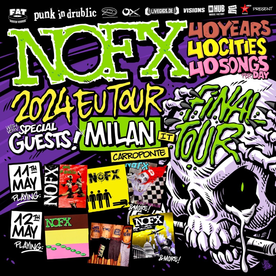 NOFXFINAL TOURWITH VERY SPECIAL GUESTS11-12 MAGGIO 2024CARROPONTE - SESTO SAN GIOVANNIMILANO40 ANNI. 40 CITTA'. 40 CANZONI (AL GIORNO). La leggendaria band capitanata da Fat Mike si congeda dopo 40 anni di carriera con uno speciale tour d'addio che partirà proprio dall’Italia, l’11 e 12 maggio al Carroponte di Milano, un’imperdibile doppia data per l’ultimo saluto … Leggi tutto NOFX: il ritorno in Italia con due date per il tour d’addio